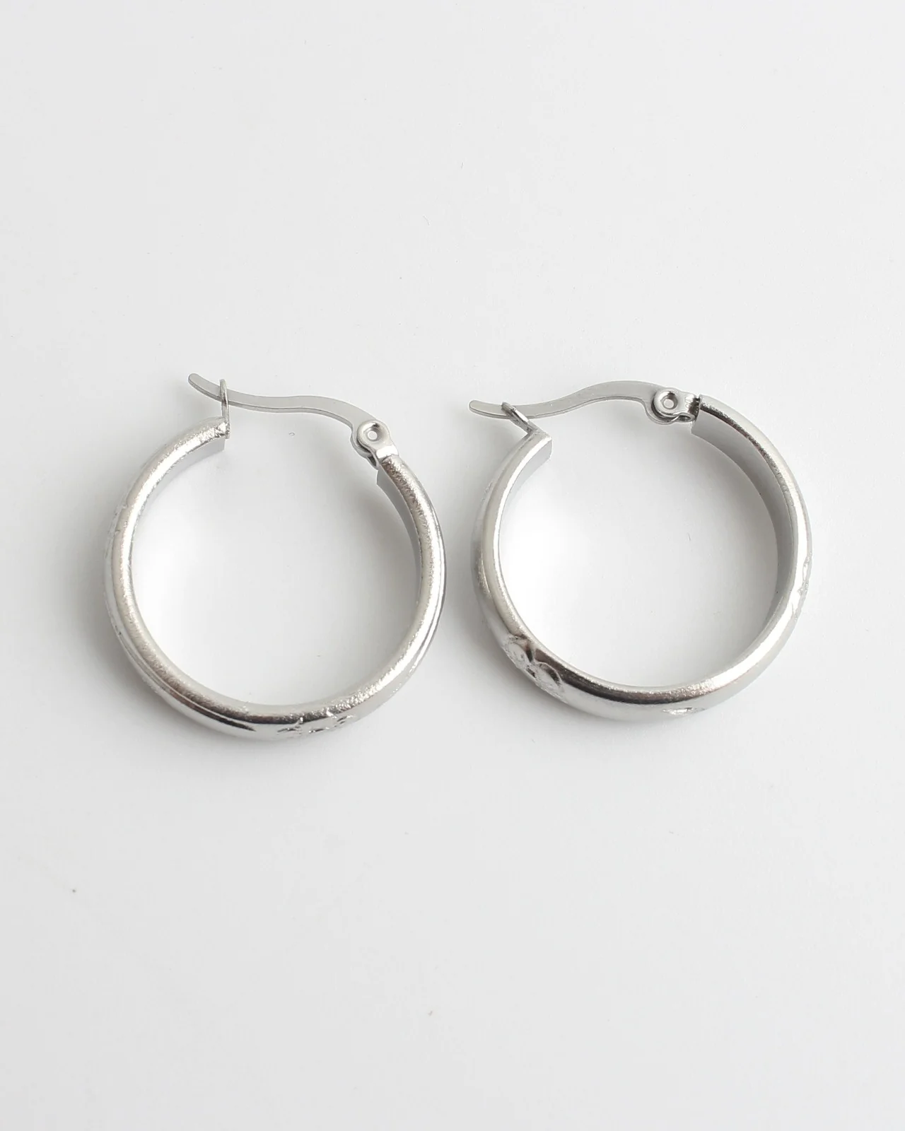 Diese schönen Reifchen mit eingravierten Blumen sind ein Muss! Die Reifen sind ca. 2,2 cm groß und aus Edelstahl gefertigt. Kombinieren Sie sie mit einem hübschen Ohrstecker oder einem anderen Reifen und Sie sind bereit zu gehen! Verkauft als Zweier-Set.