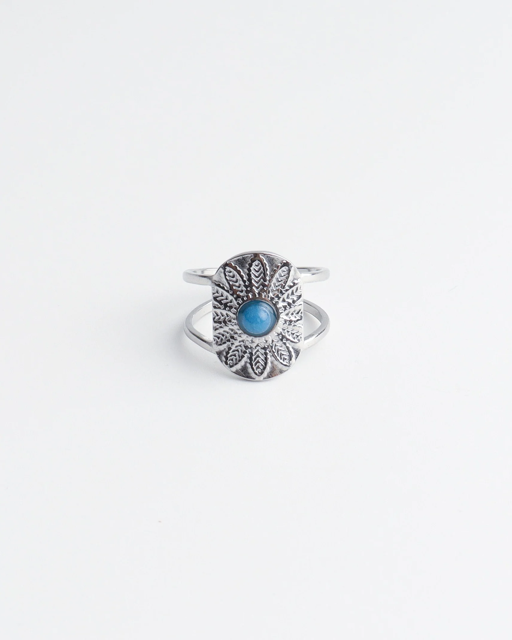 Ring mit floralem Muster und blauem runden Stein in der Mitte.