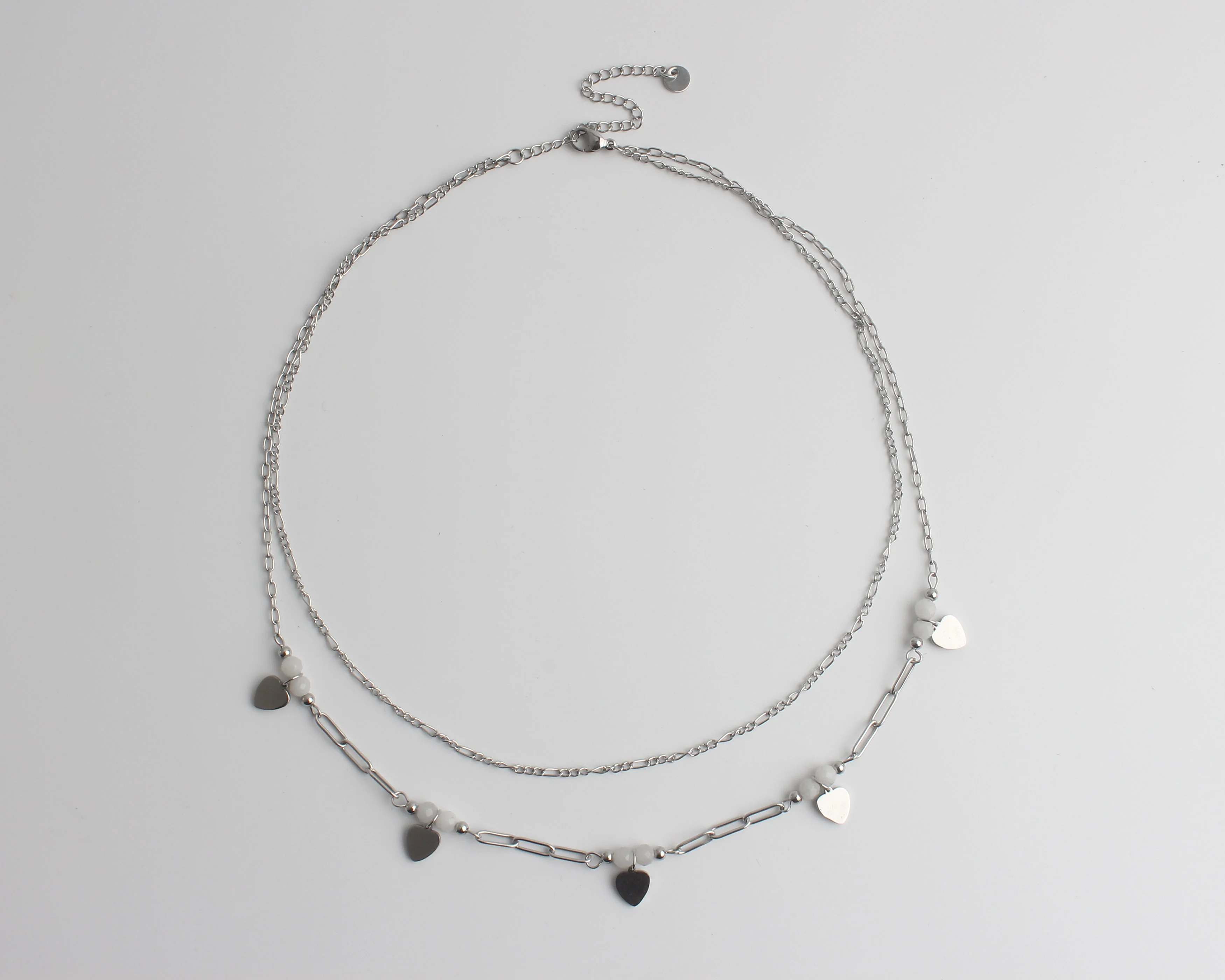 Eine raffinierte, doppellagige Halskette, die dezent mit Natursteinperlen und herzförmigen Details verziert ist. Die Kette ist aus hochwertigem Edelstahl gefertigt, wodurch sie wasserdicht und anlauffrei ist und sich perfekt für den täglichen Gebrauch eignet. Dank des verstellbaren Verschlusses können Sie die Kette in der von Ihnen gewünschten Länge tragen. Kombinieren Sie sie mühelos mit anderen Halsketten oder tragen Sie sie allein für einen minimalistischen Look. Durch die Verwendung von Natursteinen ist jedes Stück ein Unikat.